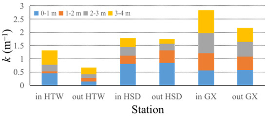 We compared the k values inside and outside the S. horneri beds among the HTW, HSD, and GX sites (Figure 2). At the surface (0–1 m layer), the value inside the bed was higher than the value outside for the HTW area, but the opposite was found in both the GX and HSD sites. For the 1–2 m water layer, the k value was higher inside the beds in GX, but it was higher outside the beds in HTW and HSD. The k value inside was higher than that which was detected outside the bed at all of the sites in the water layers if 2–3 m and 3–4 m. The depth range in which the k value inside the beds was higher than that outside of them at 1.5–2.5 m, 2–3 m, and 1–2 m in HTW, HSD, and GX, respectively (Table 1). The height of the column (Δk) could be represented as a cumulative value of k, and it was higher inside all of the sites in the following order: GX > HSD > HTW (Figure 2).