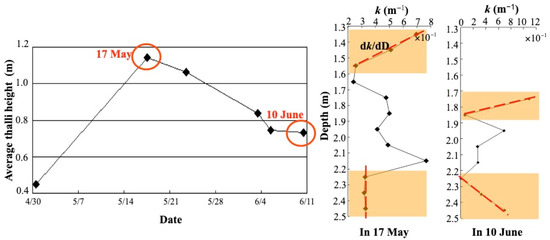 Variations in the average thalli height with the growing date from 30 April to 11 June of Sargassum horneri and comparsions of light attenuation rate k (unit: m−1) and dk/dD (unit: m−2) varying with depth (unit: m) on 17 May and 10 June in 2010 in Houtouwan.