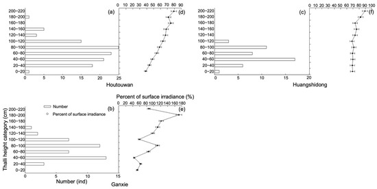 Relationships between thalli height category of Sargassum horneri from 0–20 cm to 200–220 cm in 20 cm height interval and the percent of surface irradiance (%) on 10 June in 2010 in Houtouwan (HTW), Huangshidong (HSD), and Ganxie (GX). The symbol (a–c) indicate the relationships between thalli height category (unit: cm) and thalli number (unit: ind); the symbol (d–f) indicate the relationships between thalli height category (unit: cm) and percent of surface irradiance (unit: %).