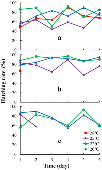 Hatching rates of Acartia bifilosa eggs which were produced under different seawater temperatures (20, 22, 25, and 28 °C) and Chl a concentrations (a): 15 μg/L, (b): 10 μg/L, (c): 5 μg/L).