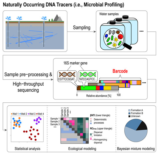 Compared with classic chemical/isotopic tracer methods, DNA-based tracers require more careful experimental handling for contamination control and biological molecule preservation (e.g., samples need to be kept cold/frozen), leading to increased logistical costs. However, such costs can be well compensated for by the improved specificity and the wealth of subsurface information that can be obtained by DNA-based tracers. Among synthetic DNA-based tracers, naked DNA tracers have the advantage of being commercially available and relatively easy to implement. However, adsorption to geological materials and degradation by environmental stressors have limited the use of naked DNA, especially in subsurface environments. Encapsulated DNA tracers with a protective particle carrier alleviate the degradation problem. However, embedding DNA molecules into micro-/nanoparticle carriers (as well as subsequent DNA release) requires complex laboratory workflows. Additionally, the particle carriers may generate aggregation and filtration problems. Compared with typical environmental tracers, naturally occurring DNA tracer methods (i.e., microbial profiling) involve more complex sample processing workflows and produce high-dimensional data that are challenging to analyze (see Figure 2 and Section 4). However, the sample processing workflow can be standardized [30] and is automatable. Analysis of such high-dimensional data could readily benefit from the rapid development of bioinformatics and biostatistical tools. Once these challenges are resolved, microbial community data could provide improved constraints on the origin of a given fluid and reveal flowpath information with much higher resolution compared with traditional environmental tracers.
