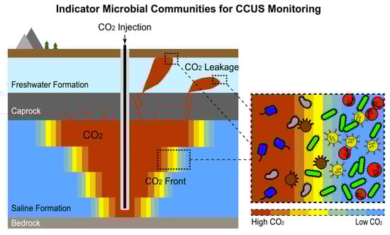 Indicator microbial communities may also be a useful tool in carbon capture (utilization) and sequestration (CCS/CCUS), as illustrated in Figure 3. Specifically, their ability to rapidly respond to environmental changes and their various pathways for assimilation of CO2 make microorganisms ideal candidates for detection of leakage and plume front at CO2 storage sites [97], providing an alternative to other monitoring methods, such as soil gas surveys [101]. A few studies have explored the community-level response of microbes to elevated CO2 levels at natural CO2 gas vents [102,103] and at dedicated field testbeds with artificially introduced CO2 to simulate a leakage [104,105,106,107,108,109,110,111]. An increasing CO2 flux is often associated with decreasing bacterial community diversity [103,104,108,111], although the reverse trend has also been observed at extremely high CO2 fluxes [102]. In a study comparing CO2-exposed communities across different types of geological formations, CO2-selected microbial communities were found to vary among sites [105]. Another study reported no significant changes in microbial community profile after CO2 exposure [107]. Overall, the current understanding of how CO2 impacts terrestrial microbiomes is limited, with contradictions in some cases, possibly owing to the spatiotemporal heterogeneities of environmental conditions in terrestrial environments [112]. Methodological limitation is another possible cause of the inconsistent conclusions reported across studies, as many studies used traditional microbial profiling techniques (e.g., denaturing gradient gel electrophoresis) with limited resolution [112]. Further studies with carefully designed experiments and employing modern high-throughput sequencing techniques are needed to gain a deeper understanding of how microbes respond to CO2 and how such knowledge can be integrated into CCS monitoring programs [97,112].