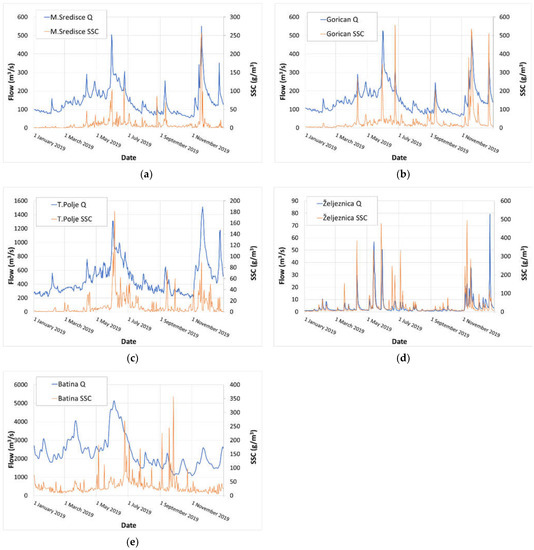 Daily flow and SSC distribution in 2019: (a) HS Mura-Mursko Sredisce; (b) HS Mura-Goričan; (c) HS Drava-Terezino Polje; (d) HS Bednja-Željeznica; (e) HS Dunav-Batina.