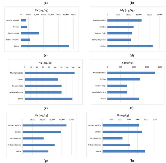 In addition, the higher Na and K contents reflect the enrichment of minerals having a high concentration of sodium (plagioclase) and potassium micaceous minerals, probably muscovite, according to the values present in soils of flooding plains [22]. The concentrations of Fe and Al in SS are comparable with their content in the topsoil of the Mura, Drava, and Bednja Rivers’ flood plains. The average highest concentration of Al measured in SS from the Danube River could result from the prevailing content of fine-grained clay fraction in the SS [22].