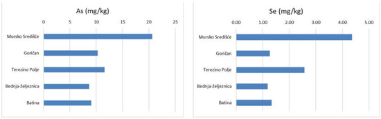 The average As and Se contents in the SS (Figure 4) followed the same distribution and could be of geogenic and anthropogenic origin (As) somewhere elevated, as the concentrations could indicate the past use of some pesticides/insecticides, but the obtained values are in the range of concentrations found in the topsoil layer of flood plains of rivers.