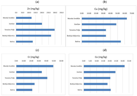 The graphical presentation in Figure 3 shows the concentration values in the analysed suspended dry matter. As shown on the map (Figure 1) and the list of locations (Table 2), the first seven values belong to the Mura River (three from cross-border HS Mursko Sredisce and four from cross-border HS Goričan). The next three are from the Drava River, cross-border HS Terezino Polje, and five samples are from the small Drava tributary, the Bednja River. Finally, at least three samples are from the Danube River, at HS Batina, close to the Republic of Croatia (HR) and the Republic of Hungary (HU) state border. The average concentrations of the elements are shown in Figure 3.