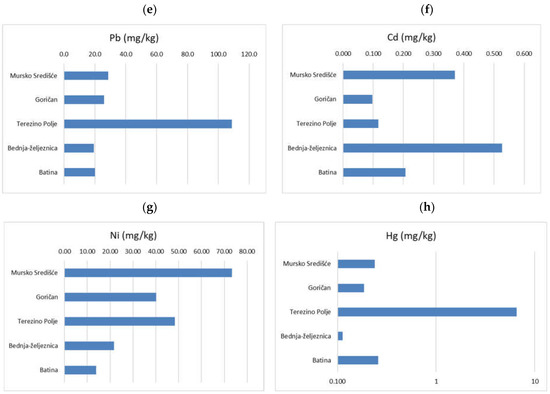 Due to mutual relations, for this research, it was necessary to refer to previous studies of heavy metals (Hg, Pb, Zn, Cu, etc.) (Figure 4) and metalloids (As) in the shallow soil layer (topsoil). In the river alluvium, due to occasional flooding, the surface of the terrain is covered with suspended river sediment [21,22]. The Drava and Mura Rivers drain the mountain massifs of the Alps, which contain mineralisation and mineral deposits of Pb and Zn. Exploitation of the mentioned heavy metals in Austria and near Mežice in Slovenia can cause an anthropogenic anomaly in the topsoil of the Drava and Mura River alluvium. The content of As, Cd, Cu, and Hg in the soils of the Drava River valley is higher than the calculated baseline values (Figure 4 and Figure 5), while Pb and Zn contents are anomalous. As, Pb, and Zn have higher concentrations than permitted for ecological food production as prescribed by Croatian regulations. An elevated Hg concentration was established in the urban area of the city of Varaždin, primarily because of traffic and fossil fuel combustion. The performed study has also shown that the mentioned metals’ content decreases with the soil’s depth to concentration values recorded before mining activity [21,23]. The Bednja River catchment also partly belongs to the Pb–Zn ore mineralisation area of Mt. Ivanščica, located in the Middle Triassic carbonate rocks near the town of Ivanec, Hrvatsko Zagorje [24]. Additionally, there is a long-standing tradition of gold panning in the Mura and Drava alluvium area. Tiny grains of gold originated from mining activities of gold and silver ore deposits in the Austrian Alps province of Carinthia [25].