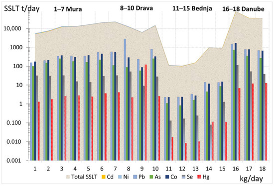 However, given their toxicity, large amounts of dangerous heavy metals such as lead, nickel, and cobalt and the metalloid arsenic are of particular concern. From Table 4 and Figure 7, it can be seen that a considerable amount of lead (Pb) is transported in suspended sediment in the Mura River (HS Goričan), Drava River (HS Terezino Polje), and Danube River. The highest value of 2801.32 kg/day was measured at HS Drava-Terezino Polje during peak discharge Q = 1306 m3/s, followed by 1513.44 kg/day at HS Dunav-Batina, on the recession site of the highest peak flow hydrograph (Figure 2e). At HS Batina, large quantities of aluminium (182–318 t), calcium (2507–4021 t), and other elements such as iron (Fe), manganese (Mn), and magnesium (Mg) were carried through the Danube River.
