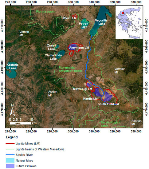 The broader research area is part of larger lignite basins of western Macedonia, formed during the Pliocene. The region has a complex of natural lakes (Chimaditida, Zazari, Petron and Vegoritis) (Figure 1). Vegoritis Lake is located in the homonymous closed hydrological basin in western Macedonia, Greece, and is the final receiving body of the basin runoff, with a total area of 2000 km2. Vegoritis Lake is also the surficial feature of a major karstic aquifer [23]. Therefore, any alteration in the surface or groundwater conditions within this area would affect the level of the lake. The primary water discharge into the lake is achieved via the Soulou River [24,25]. Therefore, the main priority of the PPC is not only the protection of the natural lakes but also the monitoring of the artificial lake evolution developed in the open voids of the closed lignite mines, as well as the evaluation of the chemical properties of lake water and of the new aquatic ecosystem that is formed.
