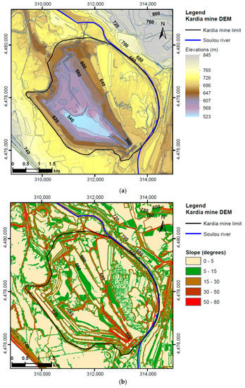 Kardia lignite mine geomorphology, Greece (Coordinate Reference System GGRS87/Greek Grid): (a) digital elevation model (DEM) of the open pit; (b) slope model (in degrees).
