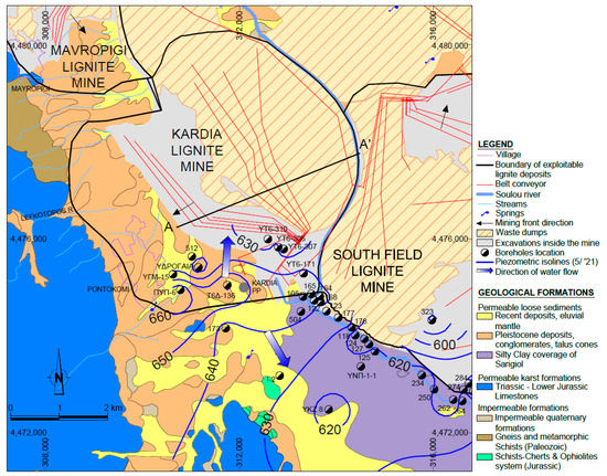 Hydraulic conductivity ranges from 1.03 to 25.92 m/day, according to pumping tests analysis [36], with an average value of 13.48 m/day. The upper aquifer’s thickness is estimated in the order of 100 m [24,36] and thus, transmissivity presents an average value in the order of 50 m2/day on the west side of Kardia excavation and a range of 200–1200 m2/day in the south region, while the average hydraulic gradient towards the excavation is approximately 2%, as depicted in Figure 3.