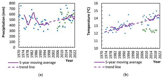 Mean annual: (a) rainfall and (b) temperature from the Kozani weather station (blue color) and Ptolemaida weather station (green color), northern Greece.