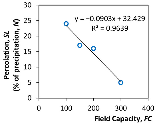 In the calculations, it was considered that deep percolation takes place when soil moisture reaches 70% of the field capacity () [32], where is the amount of water remaining when downward drainage has markedly decreased. Therefore, the following equations were applied for the different cases [30]: