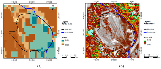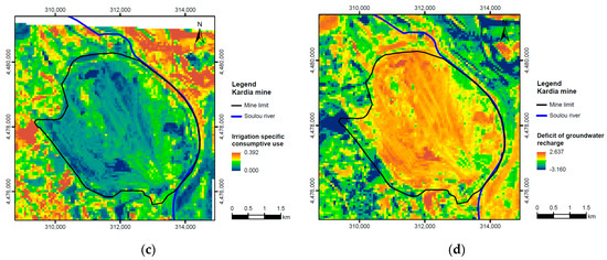 Spatial distribution of: (a) runoff coefficient by processing European raster; (b) spectra indices of using Landsat-8 (image acquired in July 2018); (c) irrigation-specific consumptive use (m3/m2); (d) annual drawdown in m, corresponding to the deficit of groundwater recharge due to excessive irrigation consumptive use of groundwater in Kardia lignite field, northern Greece (Coordinate Reference System GGRS87/Greek Grid).