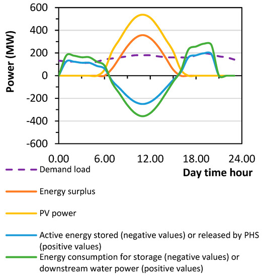 Analyzing the electricity demand is a prerequisite for optimal planning of a hybrid PHS system. Figure 10 presents a representative scheme for the hybrid pumped hydro storage (HPHS) plant operational schedule during daytime hours for the case study area of the Kardia mine. This scheme presents the integration of RES electricity production and the utilization of a hybrid plant. A linear programming optimization model using the simplex method [50] has been developed, where the objective function value addressed to the capacity factor [51] of the PV park is maximized. The main restriction is that the sum of the PV power produced, the energy released in PHS and the grid supplementary power should meet load demands. Another restriction concerns the water balance in the PHS system, where the quantity of the water pumped into the upper reservoir equals the quantity of the water released downstream into the lower reservoir.