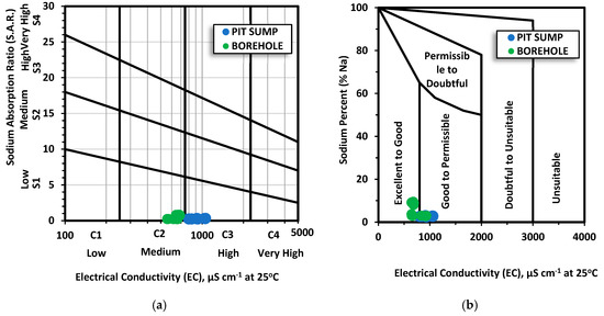Classification of groundwater and the mine’s internal sump water for irrigation purposes: (a) diagram of sodium hazard (sodium adsorption ration) and salinity hazard (electrical conductivity) [59,60]; (b) suitability of water for irrigation use, according to Wilcox diagram [61].