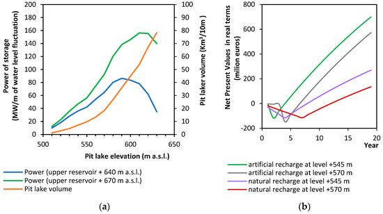 (a) Potential power of storage provision (MW/ m of water fluctuation) in relation to pit lake volume and water level, considering 1.0 m for the pit lake level variation (), in the case of the upper reservoir mounted inside the mine (+ 640 m a.s.l.) and outside the mine exploitation area (+ 670 m a.s.l.) and, (b) indicative net present value in real terms () in alternative scenarios of the pit lake’s elevation and filling procedure, inside the Kardia mine, Greece.