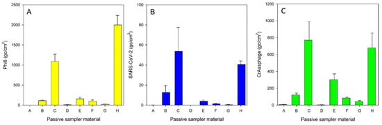 Recovery of the (A) enveloped virus Phi6, (B) SARS-CoV-2 RNA, and (C) the faecal marker crAssphage from spiked wastewater by 8 different passive sampler materials after incubation for 1 h. Values represent means ± standard error (SEM) (n = 3). The alphabetical key to the different passive sampler materials is presented in Table 1. gc: genome copies.