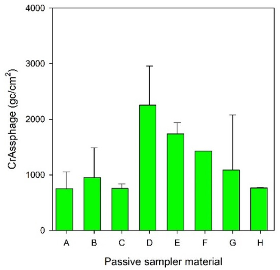 The recovery of viruses in laboratory conditions show that there was a significant difference between sampler materials. The cotton-based passive samplers yielded the higher viral recoveries. In our static incubation system (i.e., aerated, but non-flowing), we found that increasing the incubation time from 1 h to 24 h did not increase the retention of Phi6 by any of the materials (data not presented). This suggests that there is either a finite number of sorption sites on the material surface, or more likely that Phi6 is degrading, particularly at the incubation temperature used here [78,79]. Interestingly, analysis of the external bathing solution after 1 h indicated that the ZetaPlus had removed almost all of the Phi6 from solution, however, this could not be extracted from the surface of the material and thus returned a negative result. Further work is therefore needed to establish the correct conditions for successfully desorbing the virus from this surface.