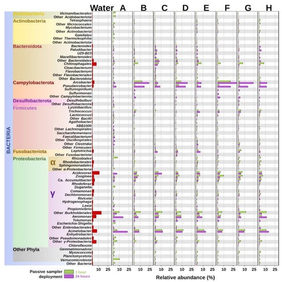 The 16S rRNA profile of the different passive samples collected after 1 or 24 h deployment at the Bangor wastewater treatment plant is presented in Figure 3. The results indicate that the bacterial profile captured by the NanoCeram passive filter (A) was very different from all the other materials, particularly after a 1 h deployment time. Generally, the 16S rRNA gene profile was dominated by Gammaproteobacteria and to a lesser extent Campylobacteria and Bacteroidia after 1 h, with many other bacterial classes also present. The profile of most passive samplers was similar to that of the liquid wastewater after 1 h. It is also clear that deployment time had a significant influence on the 16S rRNA gene profile when comparing the 1 h and 24 h profiles.