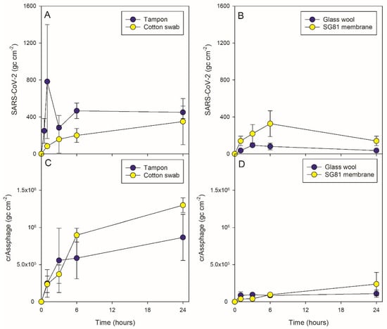 Assessment of exposure time (0–24 h) on the accumulation of (A,B) SARS-CoV-2 (upper panels) and (C,D) the human faecal marker virus crAssphage from four different passive samplers after deployment at a centralized wastewater treatment plant. Values represent means ± SEM (n = 3). The two sets of graph panels represent different experimental days and therefore cannot be directly compared.