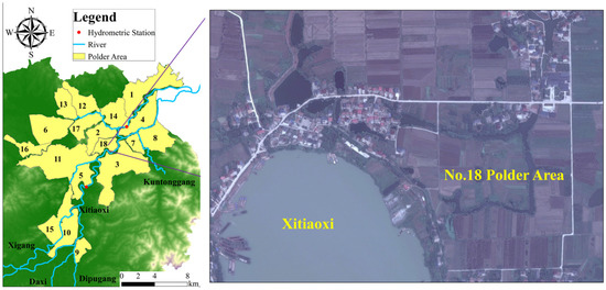 A polder area is a low-lying and easily inundated region that is protected from flooding by surrounding dikes (defending intrusive flooding), sluice gates, and pump stations (controlling internal waterlogging) [42]. Originating at Taihu Basin during the pre-Qin period, polder areas guarantee the development of agriculture and society. However, once the dikes were broken, floodwater would diffuse in the area at a high velocity. For instance, typhoon Fitow (6 to 13 October 2013) resulted in extreme rainstorms that caused over 20 dike breaks, submerging Tianzihu Town and Meixi Town seriously. According to a comprehensive investigation in 2018, there are 18 polder areas in Anji County (Figure 2). The local dikes can defend against flooding under a 10-year return period, despite several weak fragments. Without loss of generality, the No.18 polder area in Mexi Town is chosen as an example to assess the flood risk of buildings. No.18 polder area is approximately 4.04 km2, located nearby the confluence of XTX and HNG. Most buildings lay neighboring the river, which increases the flood risk.
