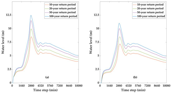 Water level series at hydrometric stations in different return periods: (a) HHS; (b) MHS.
