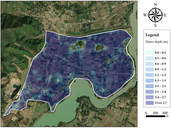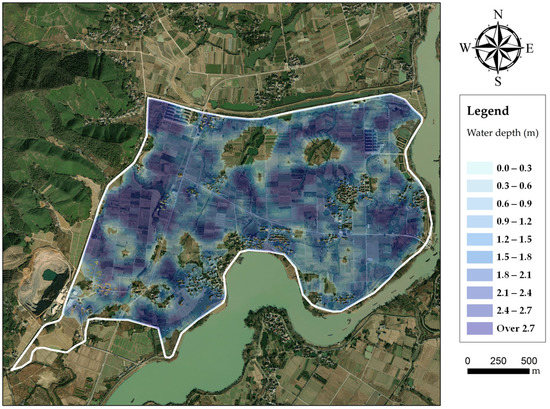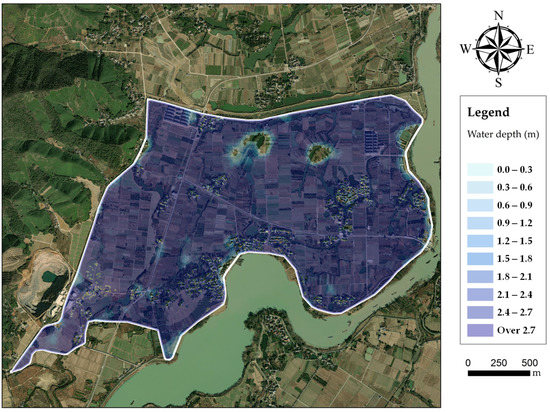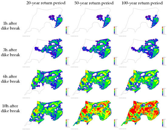 The evolution processes of floodwater in the polder are shown in Figure 7. After flowing into the polder through the dike break, floodwater rushes towards the west rapidly. Meanwhile towards the north, there are two low-lying lands located, respectively, in the middle and western area, resulting in the concentration of floodwater. For a 20-year return period, the dike break occurs at the time of 2725 min. The inundated area increases during the following 10 h, reaching the maximum value of 3.27 km2 at nearly 3350 min. It is merely flooding in 20-year return period that generates nearly the whole polder area inundated (Figure 8). For a 50-year return period, the dike break occurs at the time of 2595 min. The inundated area then rises quickly, reaching 3.75 km2 at roughly 3250 min. The maximum of water depth reaches over 1.8 m in most low-lying lands (Figure 9). For a 100-year return period, the dike break occurs at the time of 2475 min. After that, the floodwater spreads extremely fast in the polder area, reaching 3.87 km2 at the time of 3000 min. Then, the water depth in inundated areas grows gradually, the most severe inundation appears at the time of approximately 3250 min. Severe inundation occurs in the polder, as over two meters of floodwater covers most areas (Figure 10). There are no efficient drainage systems to deal with floodwater inundation in the polder area, except two pumps. Once dike breaks occur, severe waterlogging will spread in the polder area quickly, increasing the flood risk of buildings.