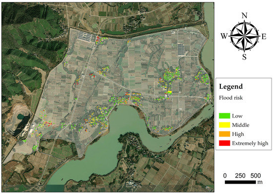 Based on the hydraulic results of simulated flood and vulnerability curves of buildings, flood risk assessment can be conducted fast. Firstly, vulnerability values at every mesh are computed according to Equation (8). Secondly, for each suburban building, weighted mean vulnerability based on surrounding mesh acreage is calculated to represent the vulnerability of this building. Finally, the distributions of buildings under different vulnerabilities in the No.18 polder are presented based on GIS mapping. It is believed that a suburban building became the ultimate state when its ξ reaches 1.2, consequently, ξ = 1.2 is defined as the bound of extremely high risk. In other situations, trisections of the interval [0,1.2], respectively, represent buildings at low, middle, and high risk.