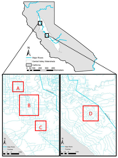 Locations of major rivers, water channels and surveyed restored managed wetland sites in California’s Central Valley. Lower left is the location of the Colusa NWR (B) and Private sites (A,C). Lower right is the location of the San Joaquin River NWR (D) sites surveyed between 2015 and 2020.