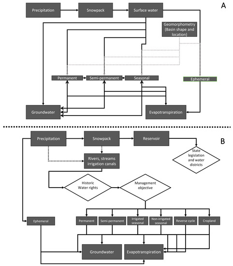 Wetland hydrology in (A) the periods prior to widespread wetland losses (pre-1850) and (B) following landscape and hydrological conversions (current era) in California’s Central Valley. Solid lines represent hydrological flows, rectangles represent hydrological stocks and diamonds represent decisions driving hydrological flows to stocks. Dashed lines represent effects of factors other than hydrology.