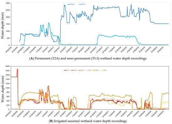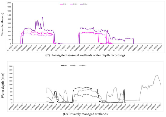 Managed wetland hydrographs representing two principal hydrological management categories—(A) permanent, semi-permanent; (B) irrigated seasonal; (C) unirrigated seasonal and (D) privately managed wetlands. Wetlands that were monitored for less than one year are not shown.