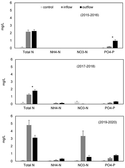 Mean (±S.E.) nitrogen (total nitrogen, ammonium-nitrogen, and nitrate-nitrogen) and phosphorus (soluble phosphates) measured at managed wetland inflows and outflows in California’s Central Valley during exceptional drought (2015–2016), above average water conditions (2017–2018) and during average water conditions (2019–2020). Controls were unopened 500 mL bottles of drinking water. Significant differences (p < 0.05) are denoted with an asterisk.