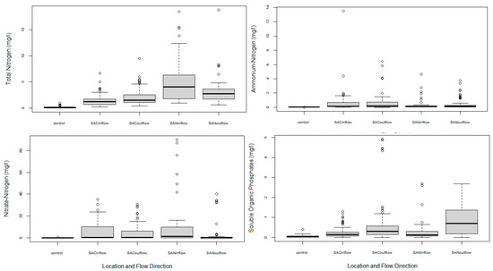 Our results indicate that differences in nutrient concentration (Figure 5) and loads (Figure 6, Table 2) among wetland management types are related to location and source water. Total nitrogen, nitrate-nitrogen, ammonium-nitrogen and soluble organic phosphorus concentrations measured over the course of this study fell well within the limits observed by other studies in the region. With the exception of outliers, wetlands in the San Joaquin Basin generally received higher concentrations of nutrients than the Sacramento Basin, which is in line with previous assessments [29]. Seasonal effects were also observed in previous studies [10] and may be related to a number of factors, including loading rates, substrate exposure to oxygen in the spring or vegetation mowing in the late summer. Our results indicate that, while seasonal irrigated and unirrigated wetlands serve as phosphorous sources, they reduce nitrogen loads fourfold over the fall–winter flooding period despite receiving additional nutrient inputs from migrating waterfowl [21].