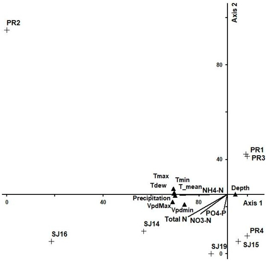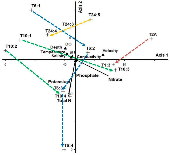 A CCA plot of serially connected wetlands found that wetlands receiving relatively fresher water formed a cluster in the upper left quadrant, associated with lower nutrient concentrations (Figure 8). Wetlands T6:1, T24:5, T10: 1 and T10:2 all received water from the West Lateral Canal, whose source is the Sacramento River. At the time of sampling, wetland unit T2:A received water pumped from the Colusa Basin Drain, which is agricultural drain water. Regardless of source, subsequent wetlands receiving water from each of the initial wetlands had increasingly higher nutrient concentrations, likely a consequence of evaporation or evapotranspiration as water flowed through each wetland. A Monte Carlo permutation test showed that the climatic data explained 41% of the variation in ordination axis 1 and influenced water quality (p < 0.05). The Dissolved oxygen continent is higher in inflows than outflows. For example, when water flows from T24:3 to T 24:4, the DO decreases from 8.32 mgl−1 to 6.74 mgl−1, respectively. Similarly, DO decreases when water flows from T6:1 to T6:2, from T10:1 to T10:3, and T10:2 to T10:4. The nitrate, phosphate and potassium show a positive correlation with Axis 1 of the ordination and a negative correlation with axis 2, while total N shows a negative and positive correlation for Axes 1 and 2, respectively.