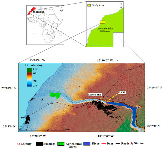Laayoune represents the largest city of southern Morocco. This area is located between latitudes 27.00; 27.25 and longitudes −12.92; −13.38 and is bounded by the North Atlantic Ocean to the west. In addition, this city is close to the Saquia El Hamra basin, which is a part of the geological unit of Tarfaya–Laayoune–Boujdour. The watershed of Saquia El Hamra covers an area of 82,000 km. This catchment is characterized by a fairly developed hydrographic network that drains Oued Saquia El Hamra, which occupies the central part of the Sahara (about 447 km long) (Figure 2).