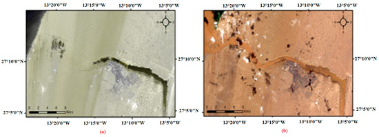 (a) Sentinel-2 RGB image (bands 2 to 4) eight days before flash flood; (b) Sentinel-2 RGB image (bands 2 to 4) one day after flash flood.