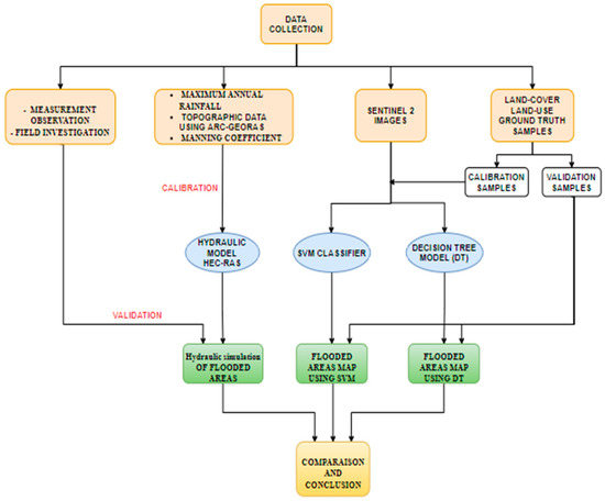In the past decades, remote sensing and geographic information systems (GIS) have also opened new opportunities to monitor large areas and create more accurate and valuable flood hazard maps [3,15,16]. High spatial–temporal resolution Sentinel images has been freely provided by the European Space Agency (ESA) for a variety of purposes. In this study, Sentinel-2 optical data was applied for floods analysis. Two techniques were used to extract information from those images: (1) land-cover/land-use classification and (2) a change detection technique. Although no model has proven its superiority, machine learning models have been proven to be better suited for sophisticated flood assessment and have greatly improved flood assessment [1,15,17,18,19,20]. In our case, we used support vector machines [21,22,23] and decision tree models [17,18,19,20,21,22,23,24] for classification and change detection, respectively.