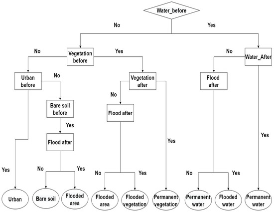 The resulting maps of the SVM classification for both dates were integrated into the constructed decision tree as inputs in order to compare the class before and after the event for each pixel, then a description for it was decided on, as explained in the tree of Figure 6.