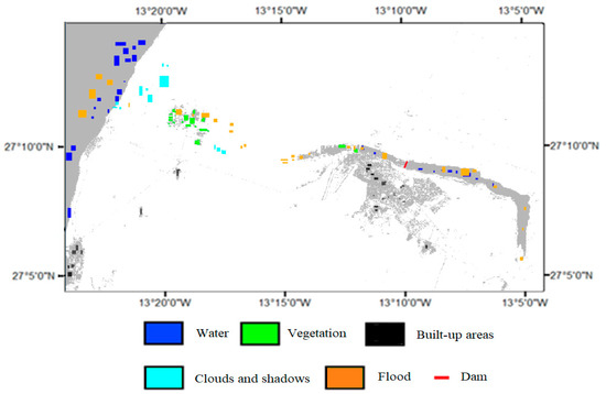 The overall accuracy and kappa coefficient are 87.31% and 0.82, respectively. The presence of clay in flooded water helped to distinguish the flooded areas, and the reflectance in the visible range and specifically the blue, red, and green spectra were enough to detect it. The added NDVI band separated the vegetation from the other classes and made the decision rule easy for the classifier. This map shows the impact that the flash flood had on the area; the overflow surpassed the dam and affected some neighboring buildings and half of the farmed zone before discharging into the Atlantic Ocean at the outlet called Foum El Oued.