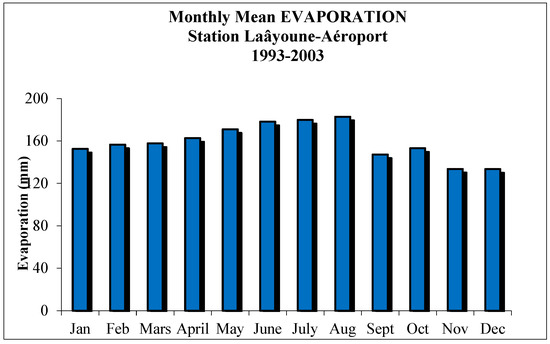 Due to the insufficiency of precipitation data, the principal hydraulic data employed in the study considered climatic data: maximum annual precipitation and flow data (From 1985 to 2016) provided by the watershed agency of Laayoune Saquia El Hamra Oued Eddahab (ABHSHOD) and the regional directorate of meteorology (DRM) Laayoune Morocco, temperatures (min, max). We used the discharge data recorded on the only station in Laayoune: airport station Hassan I, located at 27.1488° N, 13.2253° W (see Figure 1). Field supplementary measurements from the flooded areas after the event were also received through the ABHSHOD (flow velocity, water height, …). During the years 1993 to 2002, evaporation measurements were taken. The significance and rate of evaporation are primarily determined by the evaporative power of the atmosphere, which, in our case, is measured by a Piche evaporometer. This evaporation represents the atmosphere’s evaporative demand.