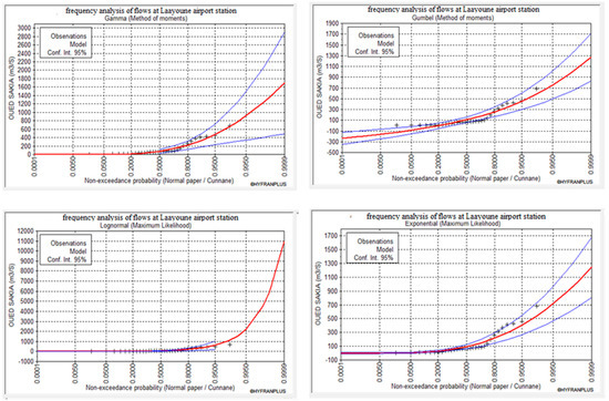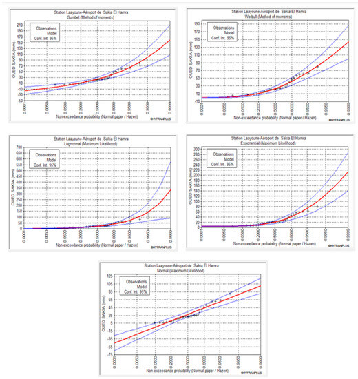 An estimate of the periods of return of the extreme values of rain can be obtained by adjusting the laws on pluviometric data. Using the Hyfran-Plus (Hyfran, 1998) and several statistical distributions, such as normal, log-normal, Gamma, Weibull, and exponential, to validate the results, the rainfall depth for various return periods was determined (5, 10, 25, 50, and 100 years). According to the analyses of the graphs of the adjustment of the statistical laws from the data of annual maximum precipitations from a series recorded at the Laayoune rainfall station over a period spanning 31 years (1985–2016) (Figure 9), the exponential distribution is the law best-adapted to the data for analyzing the periods of return, followed by the normal distribution; the other distributions have poor adjustment.