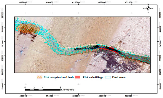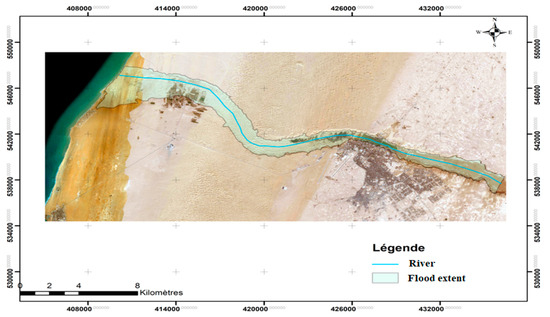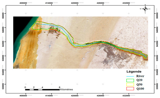 Figure 12 shows the flood extent of the studied event, and Figure 13 depicts the flood propagation outcomes for various return periods. Arc GIS uses the results of the hydraulic simulation to produce maps of the floodplain and its limits for various return periods (Q20, Q50, Q100). The results showed that, during flash floods with known flows, the water level can reach up to 13 m, with high flow velocities flooding hundreds of hectares of the surrounding plains at the northern part of the city of Laayoune and agricultural lands near Foum El Oued.