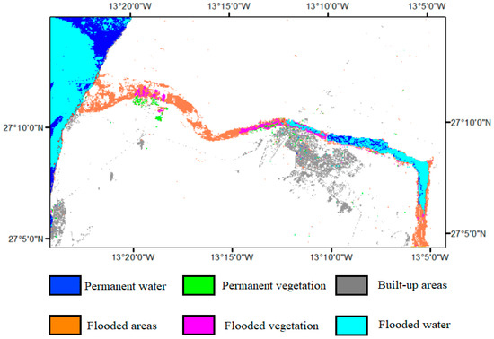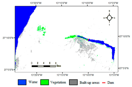 The resulting map for the first-date classification using the SVM classifier (Figure 15) shows four dominant classes that give a detail about land cover/land use in the area before the flashflood. Three main classes are distinguishable here: (1) seawater around the coastal areas (in the west) and stored dam water (in the east); (2) vegetated areas in farms next to the sea, in the central zone, and alongside the river; and (3) built-up areas, mainly Laayoune city and port on the coast.