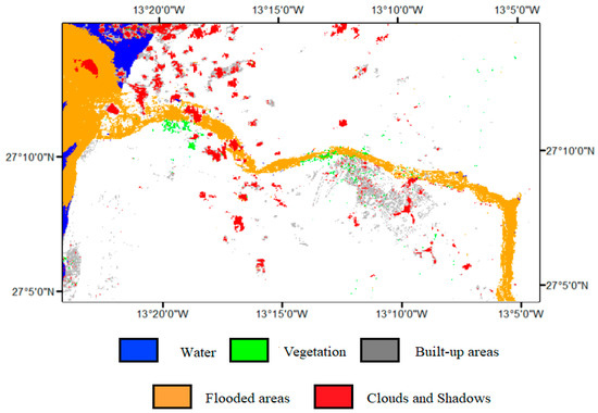 This technique also enabled us to remove the clouds and shadows, being a temporary class, as fortunately they were not present at the acquisition time of the first scene (20 October 2016). The results of the decision tree model are shown in the Figure 17. The added details can be seen on the map, as we mentioned, when we compare the cloudy date from the SVM classification, and the clouds and their shadows has been successfully removed by the rules of the constructed decision tree. Another detail is that, on this map, we can see three types of flooded areas: (1) flooded areas mainly consisting of bare soils, sands, and built-up areas that have been overflowed by water; (2) flooded water that can be explained as the permanent water that has been invaded by flooded water containing clay, which also gives an idea of the situation before and the extent of the water in the dam; and (3) flooded vegetation indicating the great damage to agricultural lands feeding the neighboring city of Laayoune, as half of them were destroyed by the overflow. A comparative mapping of both approaches is shown in Figure 18. It shows an acceptable consistency between the flooding tasks observed through change-detection-reclassified satellite images and predictions by HEC-RAS on areas with regular slopes, whether at the city level or at the cornice.