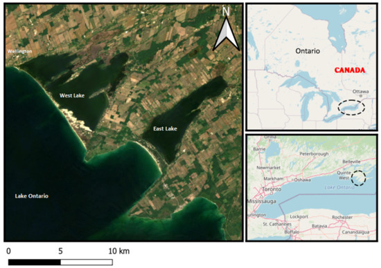The East and West Lakes were initially created around 12,000 years ago after the retreat of the last glaciers. The hydrology of the lakes is related to the underlying geology (limestone bedrock) and the on-top shallow soil [31,32], plus climate conditions and the nearby Lake Ontario. Natural and climatic conditions of the early Lake Ontario shoreline resulted in sand accumulation in the region in the past. This long-term process generated baymouth sandbars which segregated the West and East Lakes from Lake Ontario [32]. West Lake is connected to Lake Ontario through a dredged channel [33], while East Lake is connected via the Outlet River. The two lakes and the surrounding areas support some important aquatic and terrestrial species at risk [32].