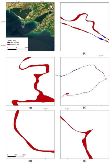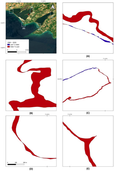 The coastal erosion and accretion detected in different parts of the study area are shown in Figure 2, Figure 3 and Figure 4. The figures demonstrate coastal changes from water to land as accretion and land to water as erosion from 1984 to 2020. Two parts are shown with more details from the adjacent Lake Ontario coasts (D and E), one part at the very end of the East Lake (C), one part at the eastern side of West Lake (B), and another zone at the narrow section of the baymouth dune between Lake Ontario and West Lake (A). The coastal change study revealed a considerable predominance of water-to-land transition in the region during the past four decades. However, there are some erosion points at East Lake and the adjacent Lake Ontario shores to West Lake. These coastal margin areas are introduced as the joint points between socio-economic, environmental, and development activities. Therefore, it is vital to monitor how potential climate changes affect the sustainability of these coastal margin areas in and around Lake Ontario and connected water bodies [27].