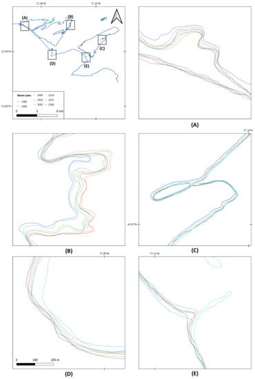 - Caspell, M.; Vasseur, L. Evaluating and visualizing drivers of coastline change: A lake ontario case study. ISPRS Int. J. Geo-Inf. 2021, 10, 375. [Google Scholar] [CrossRef]