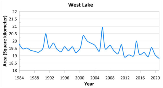 Spatiotemporal monitoring of West Lake using 1599 satellite images detected the exact area of the water body from 1984 to 2021 (Figure 7).
