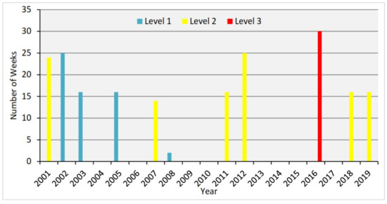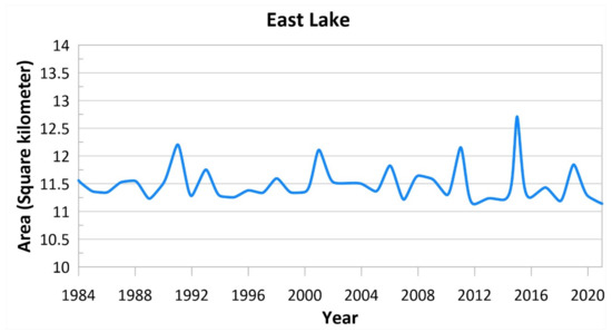 As a large lagoon (historically named Spence Lake), East Lake covers almost 20% of the East Lake watershed. Published resources expressed that the watershed is around 68 km2, and the lake area itself is approximately 12 km2 [32]. Spatiotemporal monitoring of the lake using 1599 satellite images detected the exact area of the water body from 1984 to 2021 (Figure 11).
